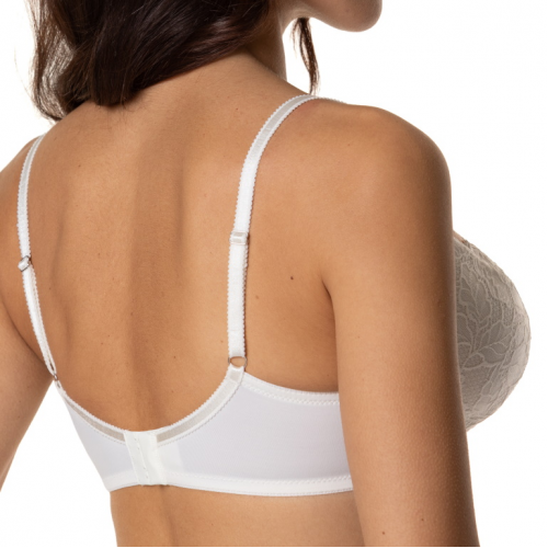 Бюстгальтер на каркасах с мягкой чашкой. Чашки овальной формы с диагональным членением создают округлую наполненную форму. Каркасы плотно прилегают к телу без излишнего давления и раздражения. Широкий стан на подкладке плотно облегает тело, обеспечивает стабильную посадку бюстгальтера на фигуре и снимает нагрузку с плечевого пояса.