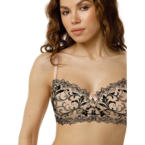 Модель с легкими, полупрозрачными чашками из изысканного шитья по ажурной сетке. Благодаря оригинальному крою чашек с двумя разнонаправленными вытачками бюстгальтер создаёт идеальную округлую форму груди.