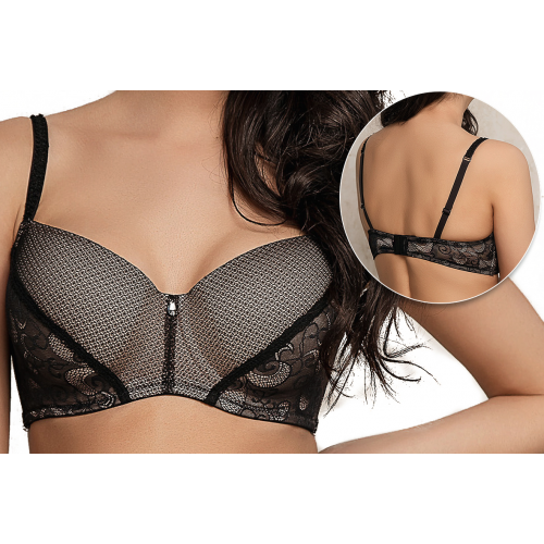 Бюстгальтер балконет, плотная чашка Dimanche 1087 из коллекции "Prestige". Модель со скрытой костью, по бокам расположены косточки для надежной фиксации. Тонкий гипюр с растительными узорами и геометрическими деталями создают потрясающие по своей красоте визуальные эффекты. Бретели декорированы кружевной тесьмой, между чашечек расположен сверкающий кристалл.