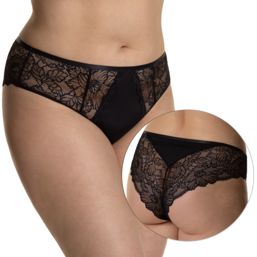 Трусы слипы из эластичного кружева и полиамидного полотна. Отсутствие резинок на задних участках срезов ножек позволяет носить трусы под тонкой облегающей одеждой. Модель имеет посадку средней высоты.