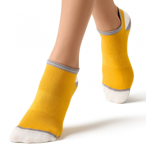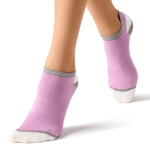 Укороченные хлопковые женские носки с контрастной комфортной резинкой и кеттельным швом. Пяточки, мыски и резинки декорированы геометрическим рисунком. Носки цветные, доступна обширная гамма оттенков.