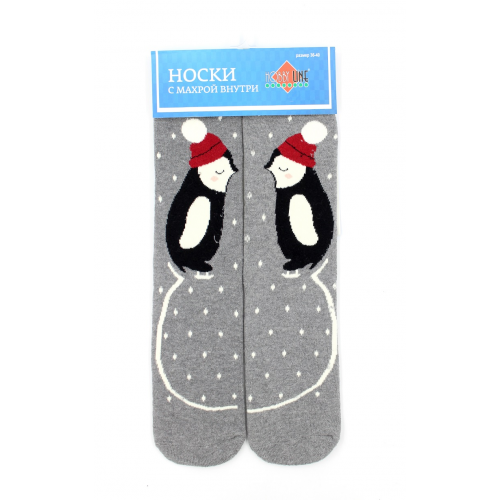 Хлопковые женские носки с махрой внутри, пингвины на сером.